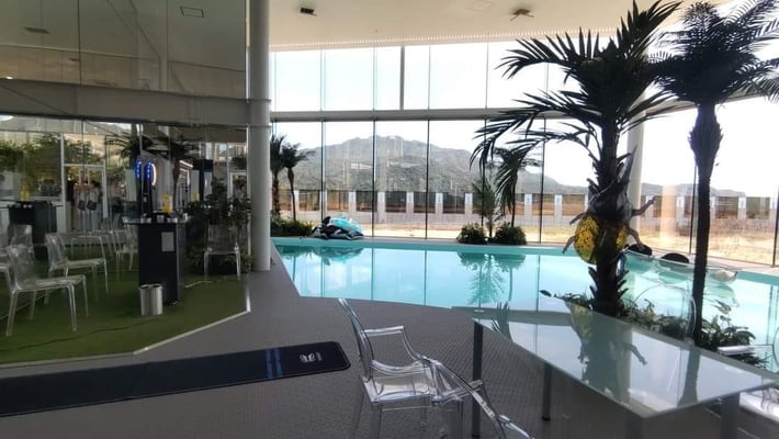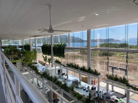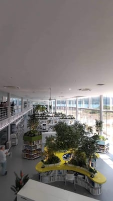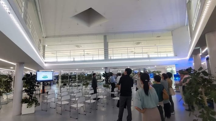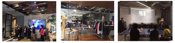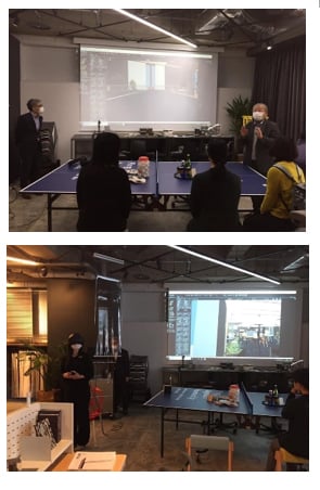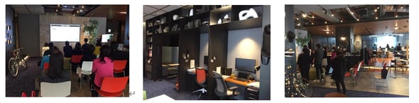 中に入ると、広々した空間が広がり、このオフィスで働く人の一日のストーリーを想定したディスプレイとなっています。程よく仕切られたデスクワークスペース、アクリル板完備のプレゼンルーム、ミーティング用のテーブルはなんと卓球台。その他さまざまなシーンを想定して作られた空間はとにかくどこを見てもお洒落。広島らしさも加味しながら考えたというショールーム誕生の秘話やあちこちにちりばめられているたくさんの工夫や機能の説明を聞きながら一時間程ゆっくり見学させていただきました。またVRによる理想の仮想オフィスの体験も一人ずつさせていただきました。
