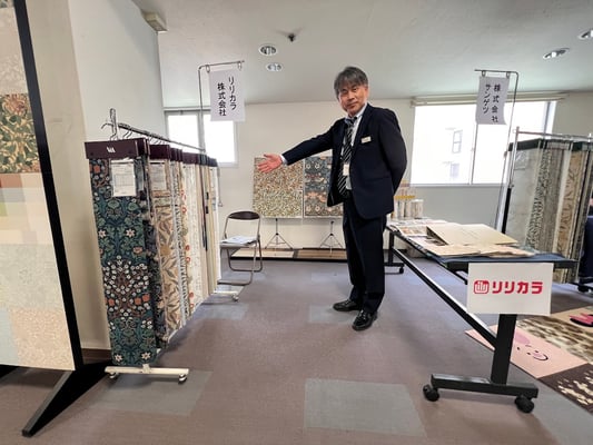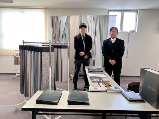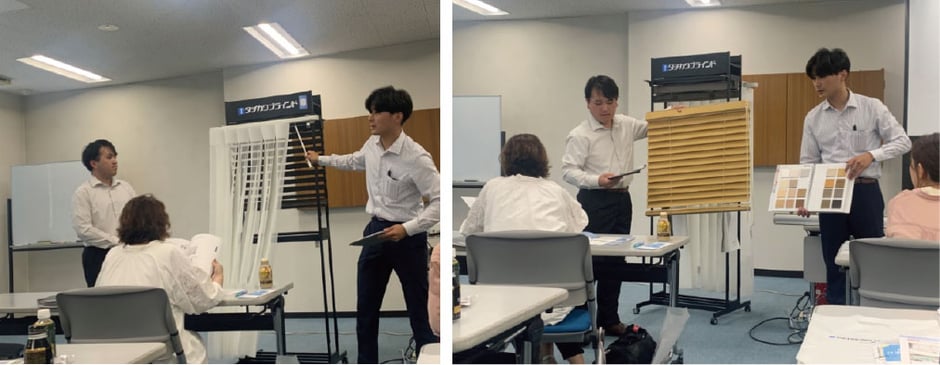 シンコーの社員の方3名がカタログ説明から始まり、次にアクセントクロス、ベースクロス、カーテンの大きなサンブルを実際に組み合わせてコーディネート提案。