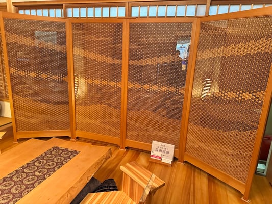 今まで見たことある組子とは比にならない繊細な組子の数々。フェラーリの本社や東京のホテルなどなどに採用されている質の高いものを見せていただきました。1千万の組子の衝立もありました!