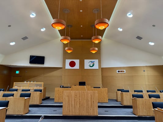 次に会員の荒木さんが木工事の現場監督をされた真庭市庁舎の見学をしました。県内産集成材をふんだんにつかった議場まで特別に見せていただき貴重な経験でした。施工者ならではの細かいおさまりの苦労話など、貴重なお話もたくさん聞けました。