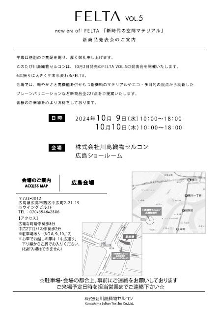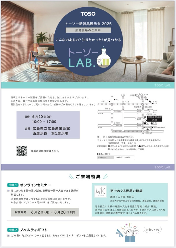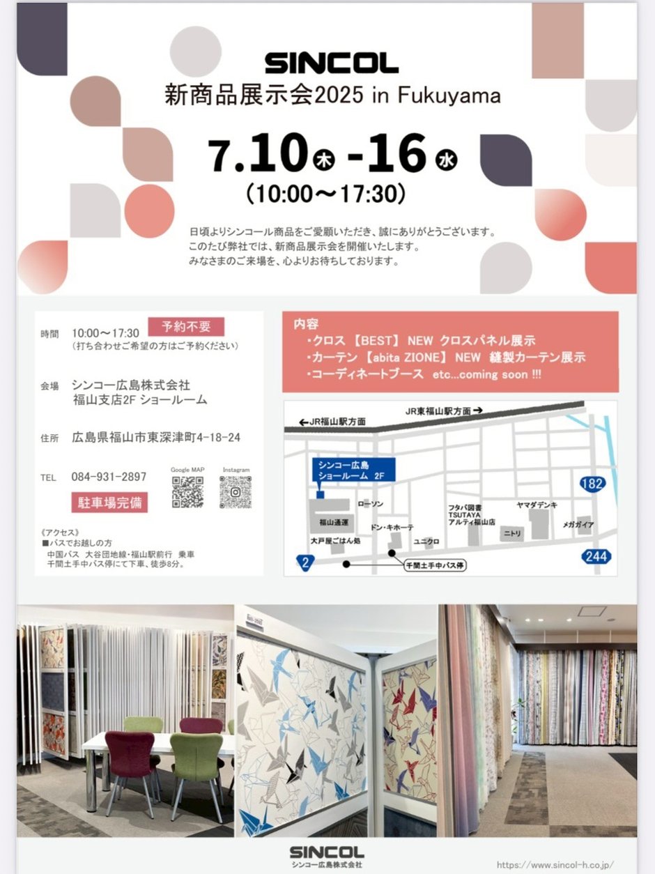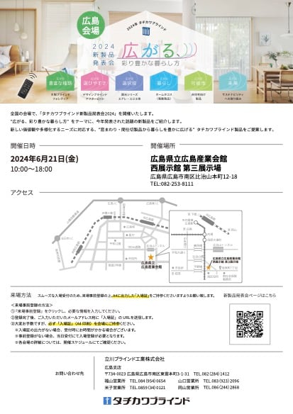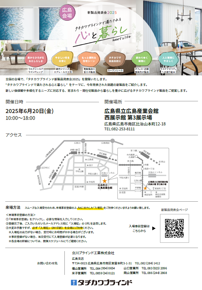 平素は格別のご愛顧を賜り、厚く御礼申し上げます。明日2025年6月20日(金) 10:00〜18:00広島県立広島産業会館 西展示館 第3展示場にて全国新製品発表会を開催いたします。当発表会は、“タチカワブラインドで満たされる心と暮らし”をテーマに、 今年発売の新製品を幅広いバリエーションで展示致します。 皆様のご来場を心よりお待ちしております。<新製品発表会のページはこちら>■開催概要テーマ:『タチカワブラインドで満たされる心と暮らし』日程:2025年6月20日(金)10:00〜18:00場所:広島県立広島産業会館 西展示館 第3展示場住所:広島県広島市南区比治山本町12-18■展示内容●『窓からひろがるわたしらしさ』「ウェルビーイング」をテーマに、新たな4つのカテゴリーをはじめ、リニューアルしたラルクシールド/ラインドレープをご紹介 ●『やさしい光を日常に』人気の調光シリーズが創り出すやわらかな風合いをご紹介●『もっと便利な住宅シーン』ホームタコス(電動製品)のスマホ操作やプレイス スウィング(間仕切り製品)による快適性・省エネ性をご紹介●『タチカワで自由自在に』新しくなったカーテンレールをご紹介●『変わりゆく環境に』間仕切り製品、電動製品、機能性スラットによる省エネ性や安全性をご提案 ●『人と環境にやさしく』サステナビリティに関する取組みをご紹介■来場方法のご案内スムーズな入場のため、来場事前登録の上、A4に出力した「入場証」をご持参くださいますようお願い致します。 ■来場者事前登録方法