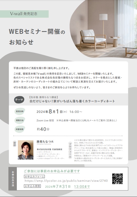 壁紙見本帳『V-Wall』の発売を記念して、8月1日(木)で以下の内容のWEBセミナーを開催いたします。